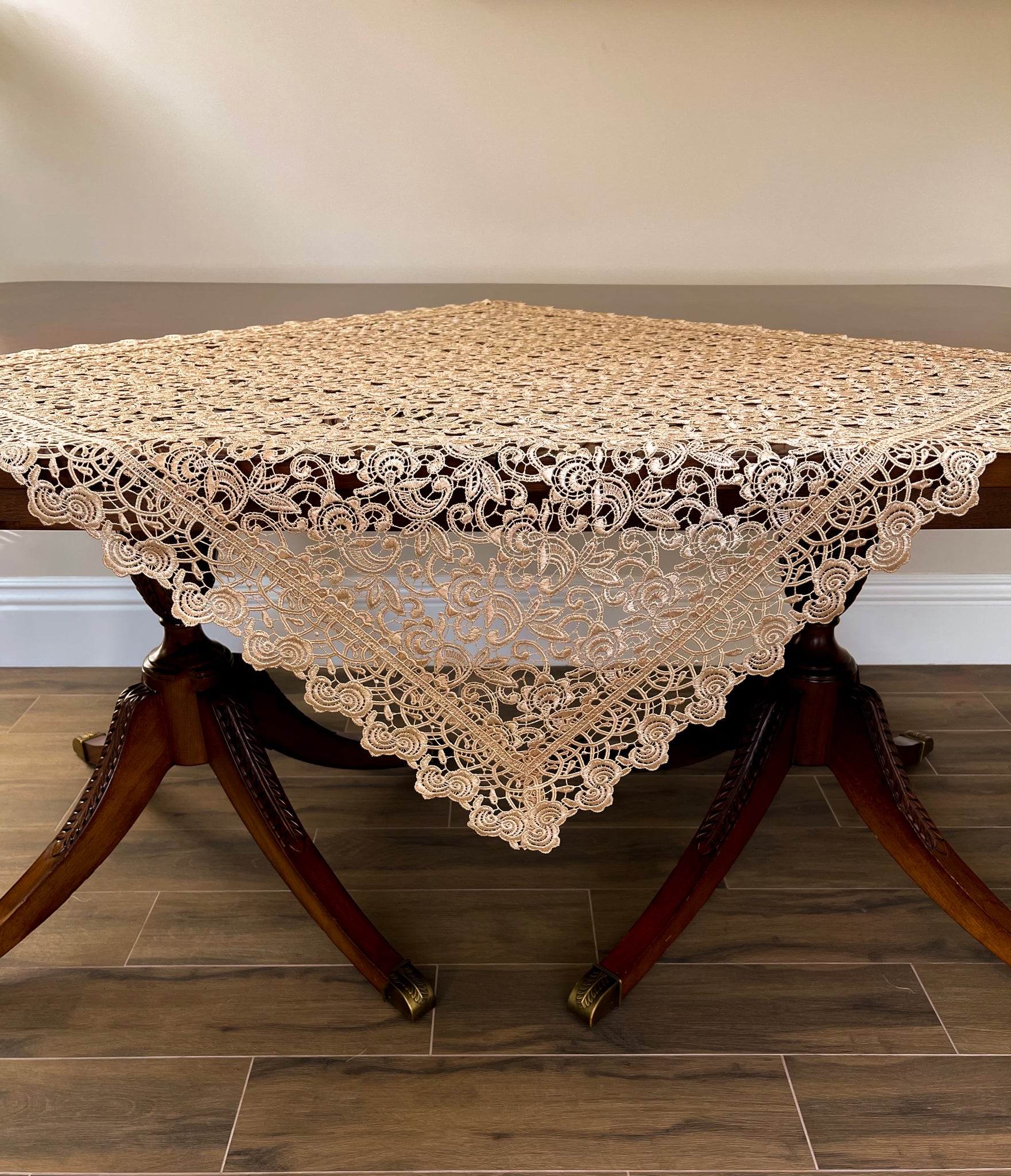 Beautiful high quality Battenberg laced table toppers are perfect for everyday use, weddings, special events, and holidays. This elegant collection is perfect for all year use on your dining table, dresser, or coffee table. There are two shapes and colors to choose from. Both are 35" x 35", but one is round and one is square.
