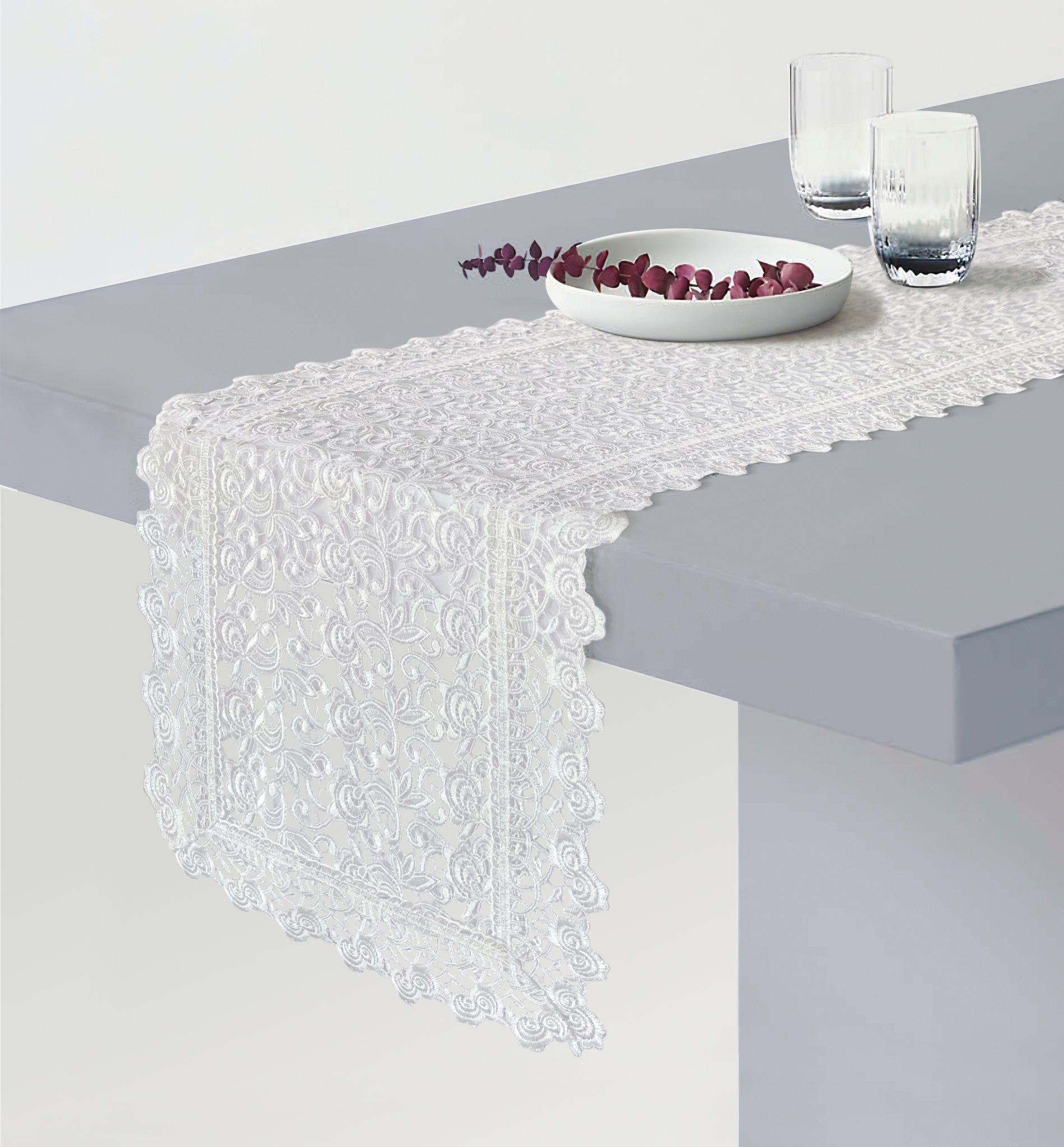 Floris Linens Carissa Luxurious White Lace Table Runner with European Pattern, Home Décor