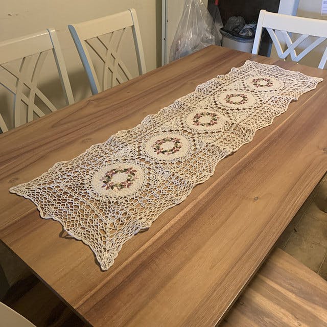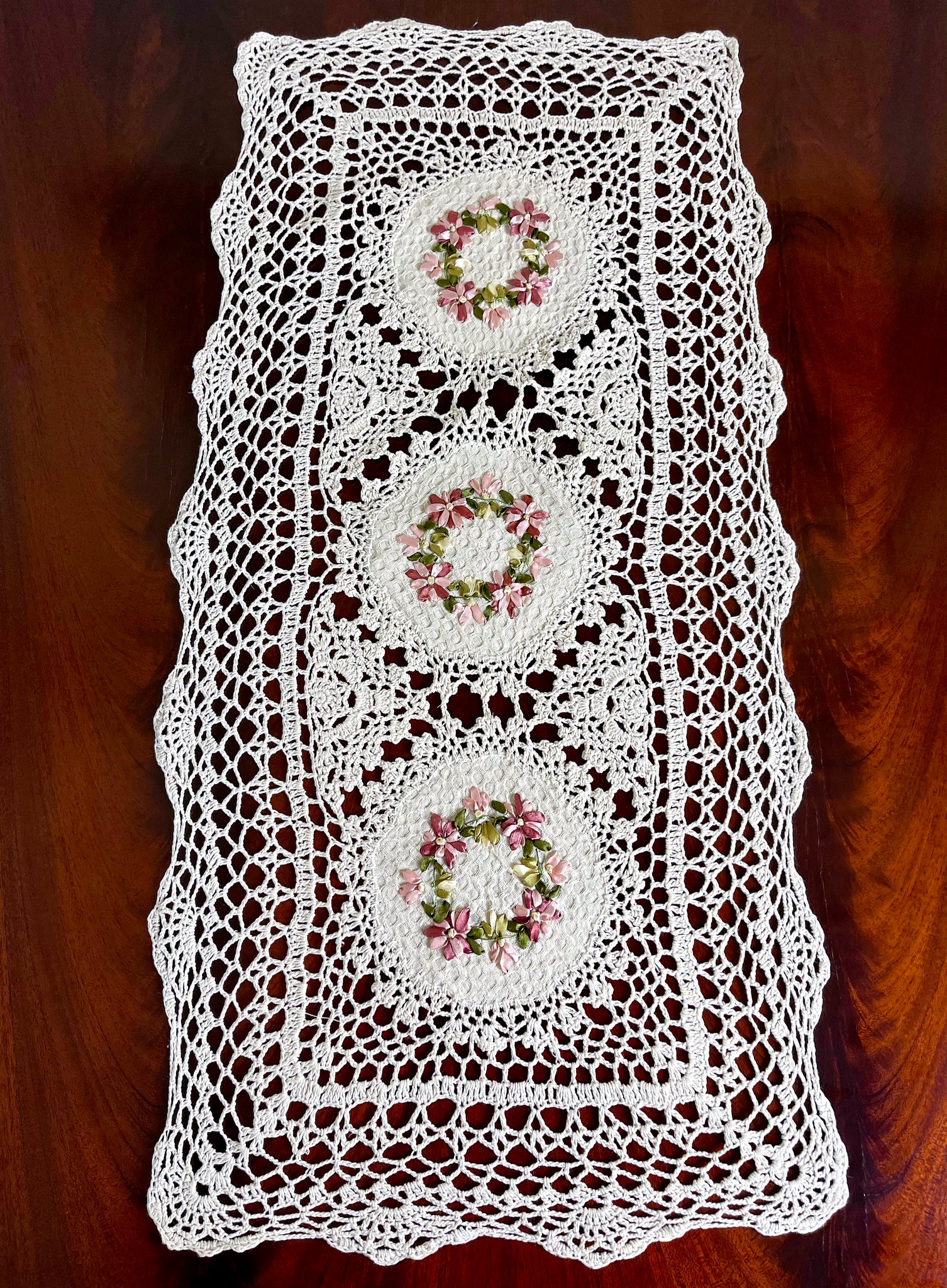 Beautiful, high quality, handmade Irish crocheted table runners with pink flowers are perfect for everyday use, weddings, special events, and holidays. This elegant collection is perfect for all year use on your dining table, dresser, or coffee table. For the best coordinated look, pair 4 placemats with a table runner.