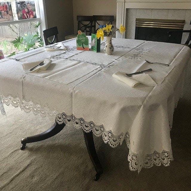 Luxurious, white, high quality Victorian lace tablecloth on elegant ivory cloth is the perfect table décor all year round. This luxurious tablecloth will instantly upgrade your dining experience.