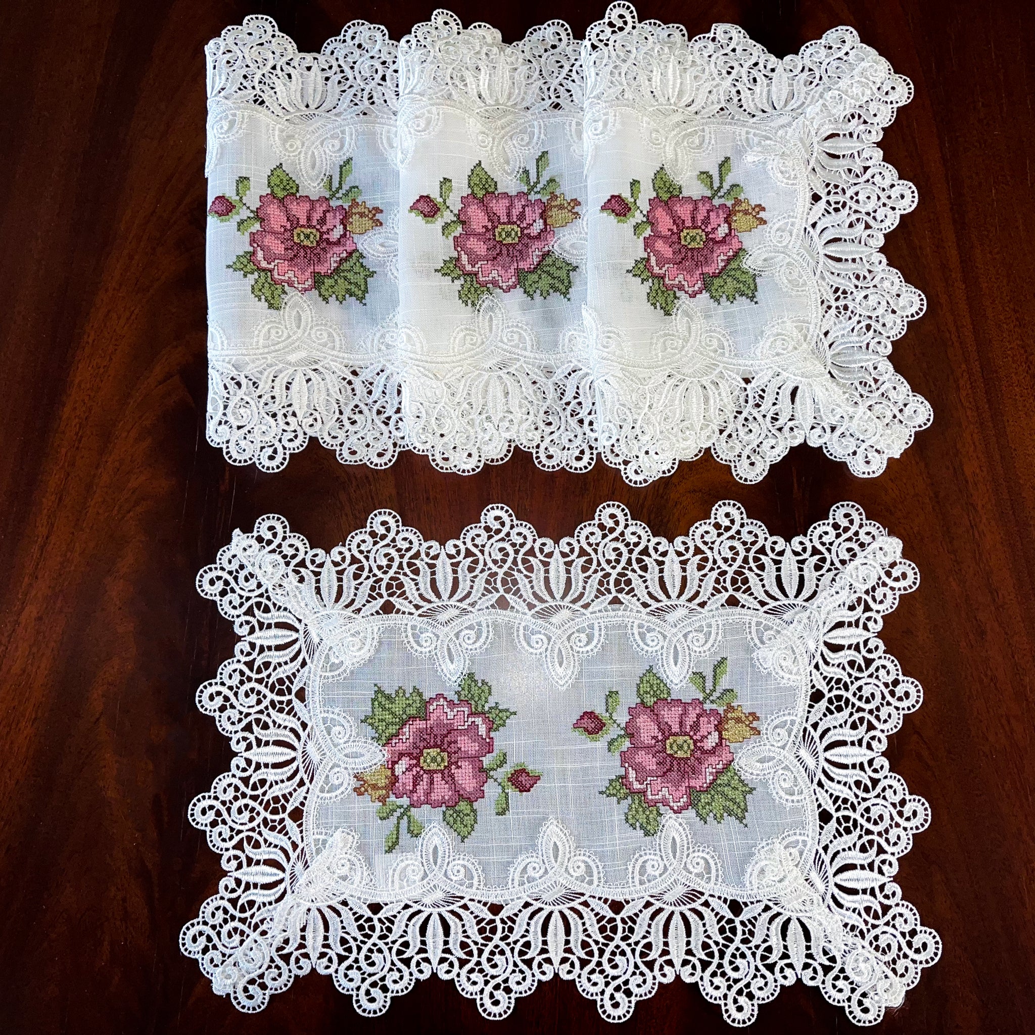 Beautiful, high-quality, laced placemats with detailed cross-stitch flowers are perfect for everyday use, weddings, and special events. This elegant collection is perfect for all year use on your dining table, dresser, or coffee table. The size is approximately 11" x 17". For the best coordinated look, pair 4 placemats with a table runner.