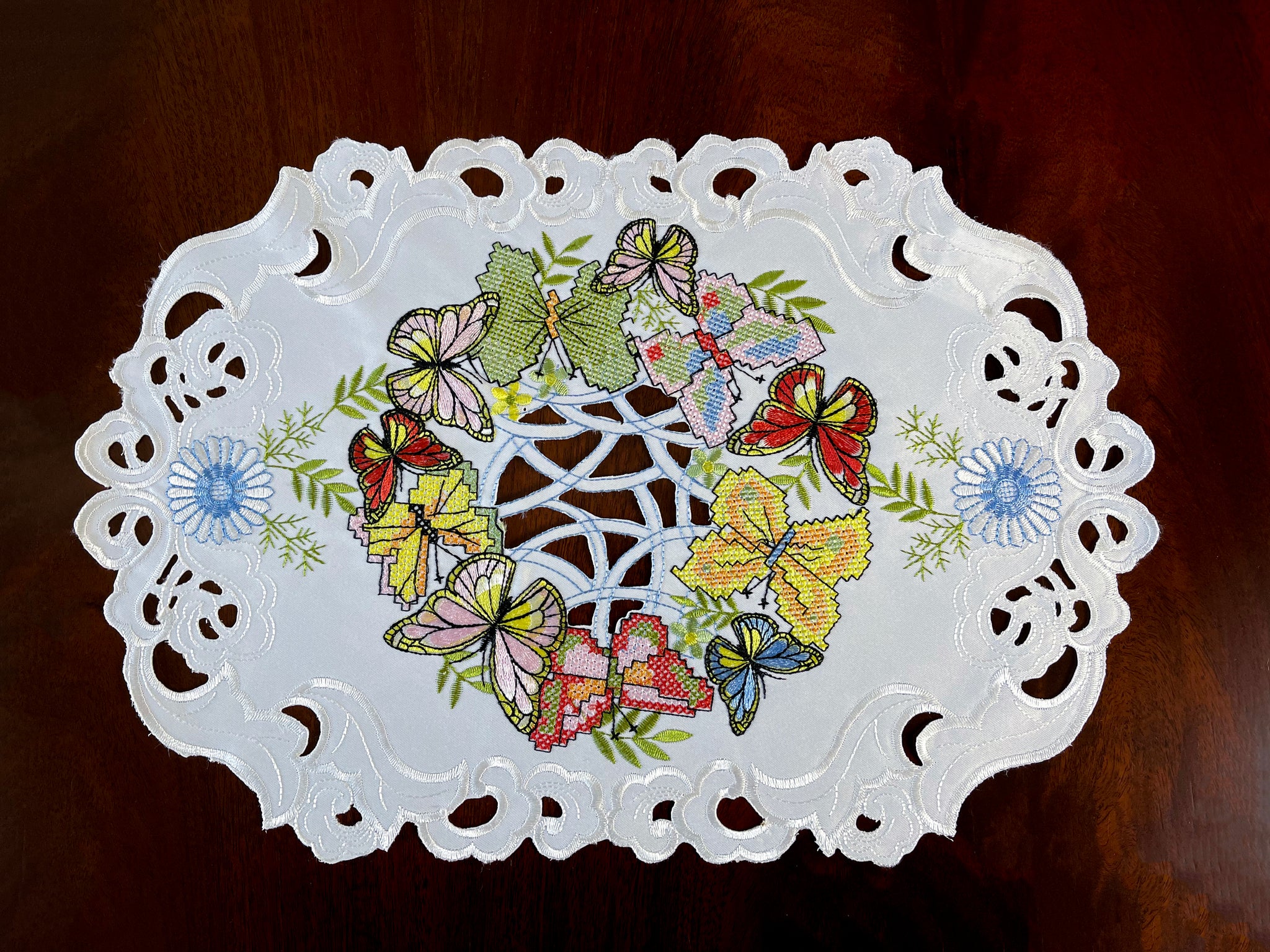 The intricate butterflies look stunning and colorful on the cutwork cloth. The fabric is 100% polyester which means you can wash it in the laundry machine on a gentle cycle and tumble dry. The piece is handmade so there may be some wrinkles when shipped in a small package. If there are wrinkles, a simple ironing will set it straight.