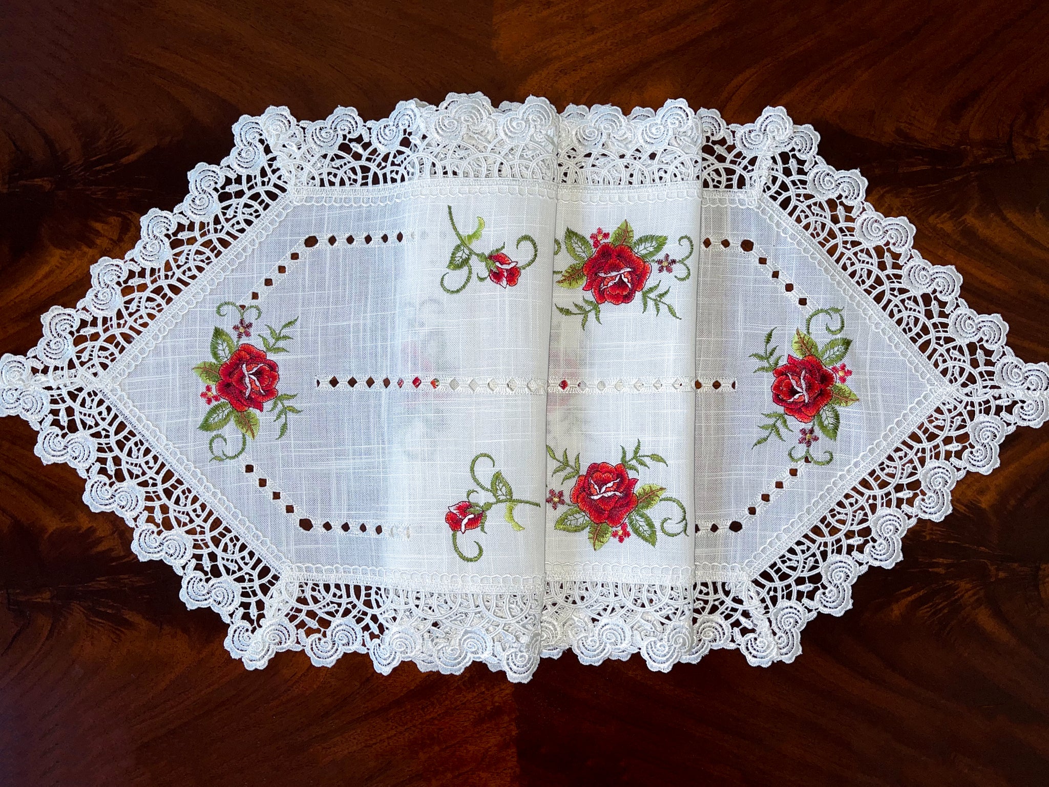 Beautiful, laced table runners with rose embroidery are perfect for everyday use, weddings, and special events. This elegant collection is perfect for all year use on your dining table, dresser, or coffee table. This item is available in many different lengths to complement your table perfectly. Please select your desired size when ordering. For the best coordinated look, pair 4 placemats with a table runner.