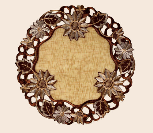 Floris Linens Set of 4 Riva Brown Leaves Embroidered Doilies on Cutwork Fabric