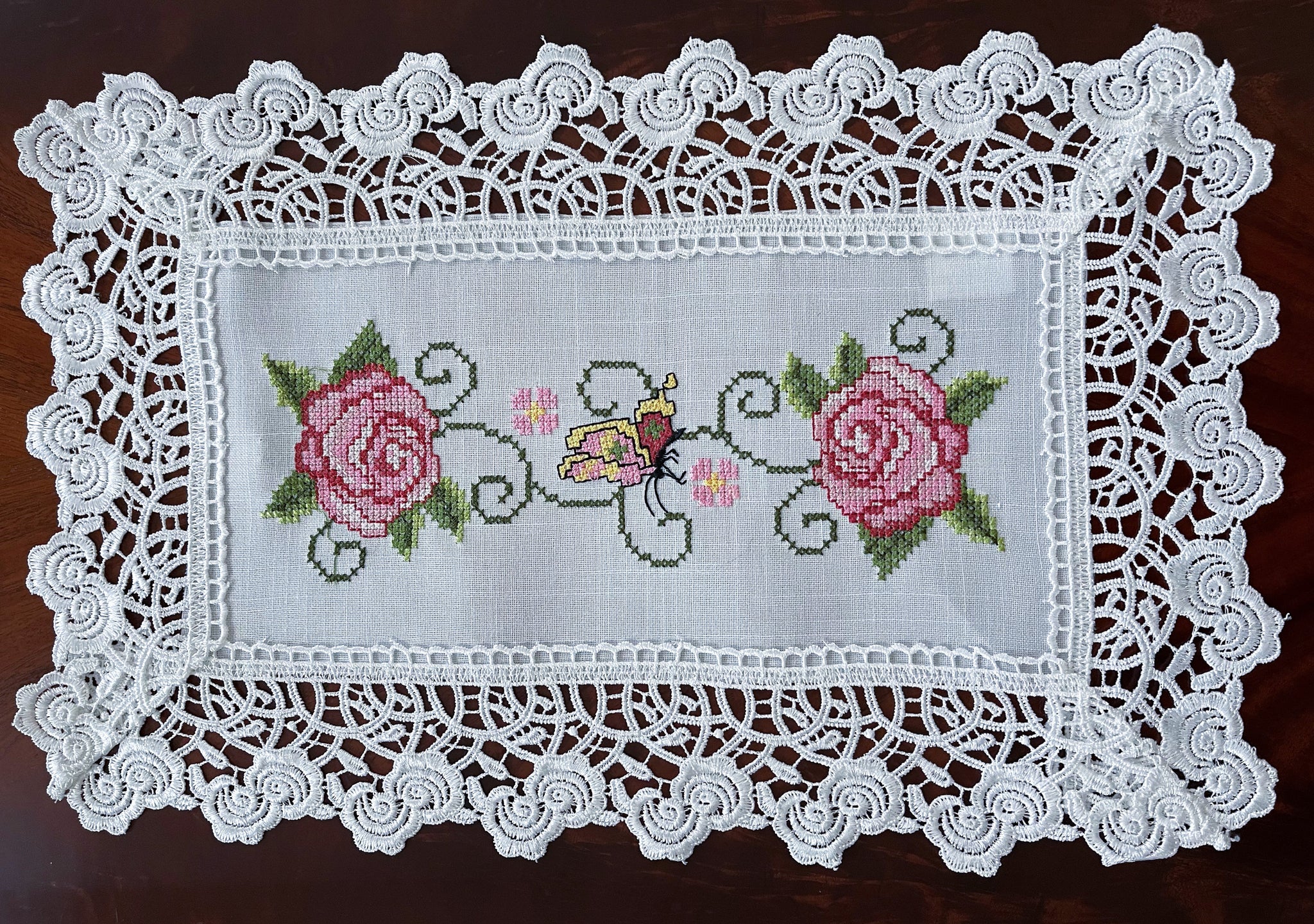 The butterfly cross stitched pattern sits flawlessly on top of the laced ivory fabric. The fabric is 100% polyester which means you can wash it in a gentle warm cycle and hang dry. The piece is handmade so there may be some wrinkles when shipped in a small package. If there are wrinkles, a simple ironing will set it straight.
