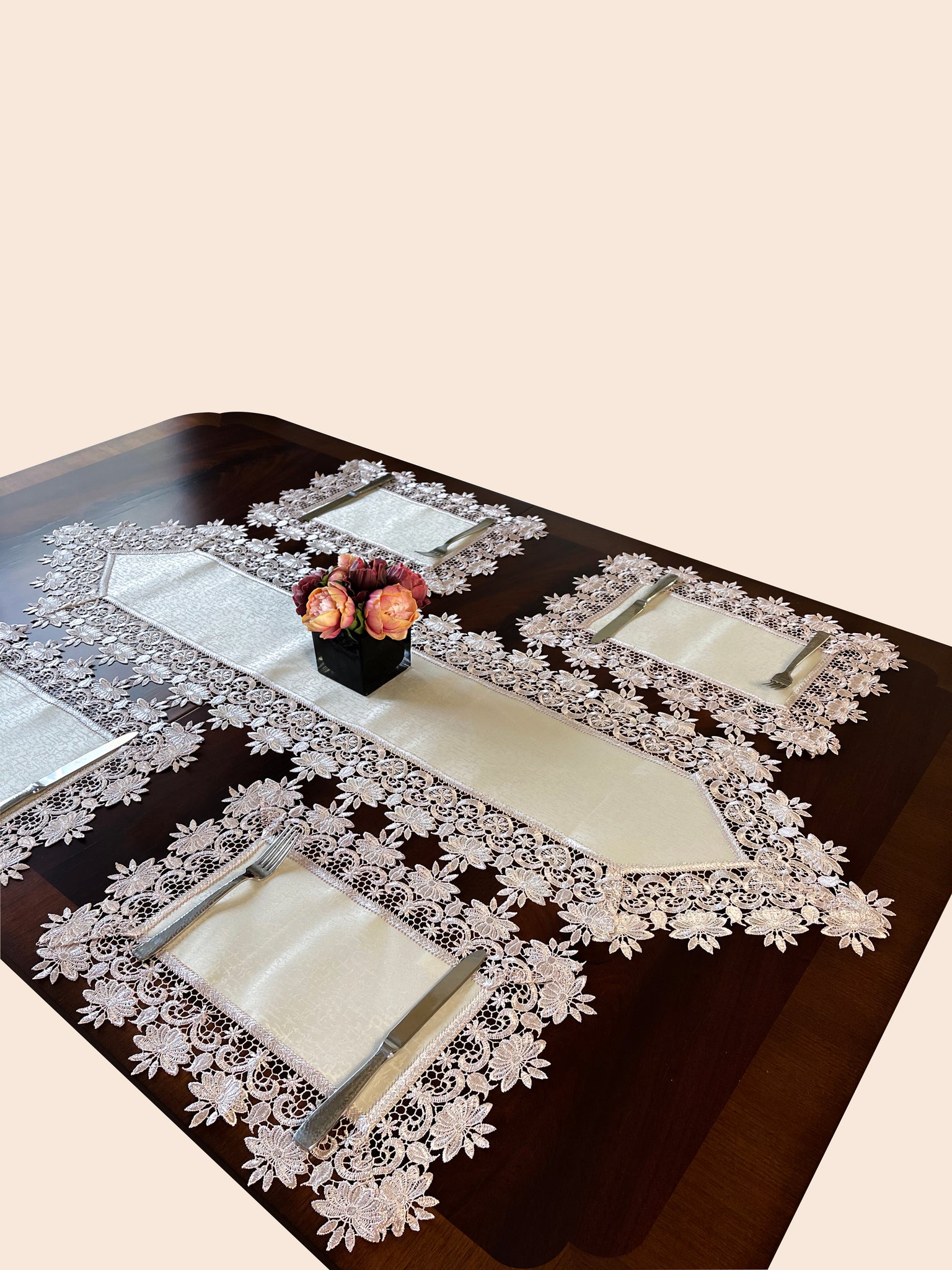 Beautiful, high quality European style lace placemat with ivory cloth is the perfect table décor all year round. This elegant collection is perfect for your dining table, dresser, or coffee table. For the best coordinated look, pair 4 or more placemats with one table runner. The size is approximately 12" x 18".