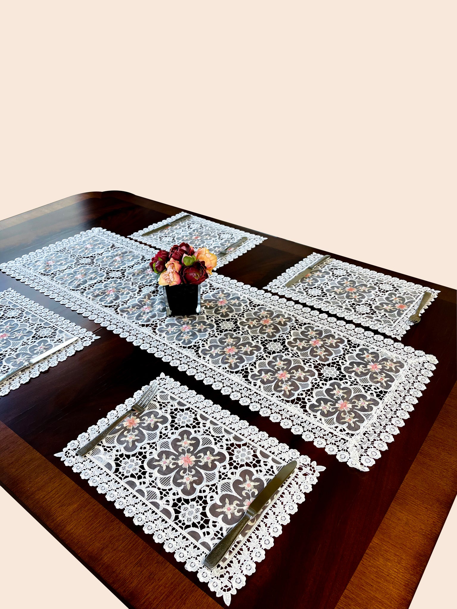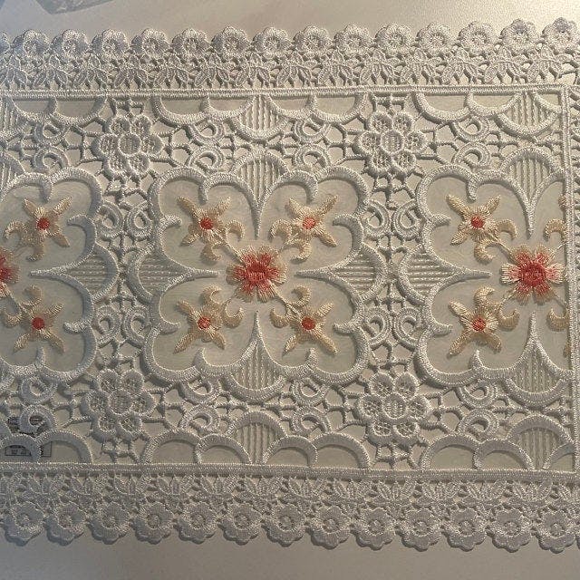 Beautiful high quality hand embroidered placemats with cute pink flower designs are perfect for everyday use, weddings, special events, and holidays. This elegant collection is perfect for all year use on your dining table, dresser, or coffee table. We also have this same collection in beige color. For the best coordinated look, pair 4 placemats with a table runner. The size is approximately 12" x 18".