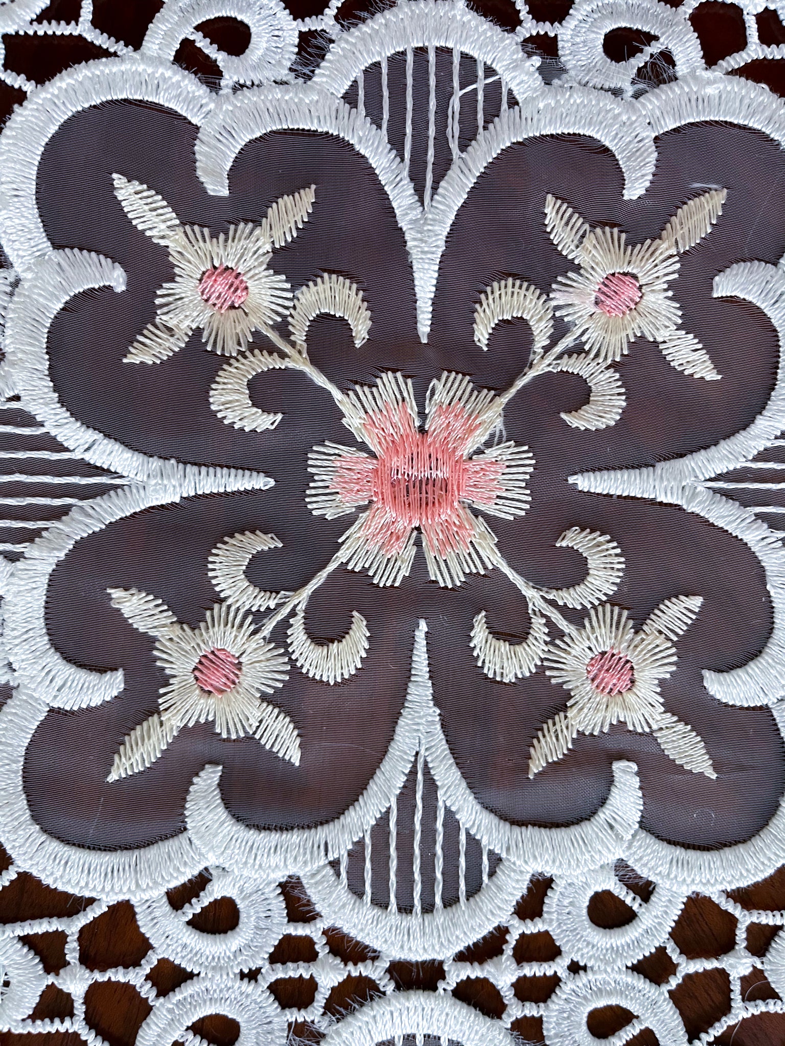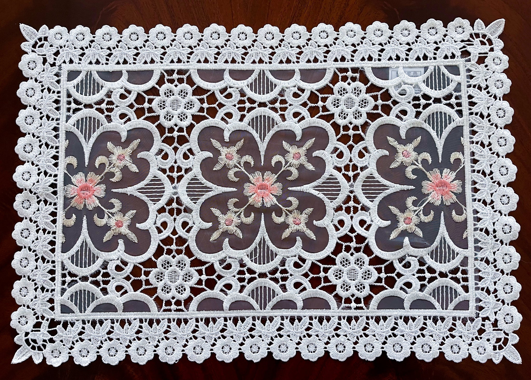 The cute pink floral pattern sits flawlessly on top of the laced ivory fabric. The fabric is 100% polyester which means you can wash it in the laundry machine on a gentle, warm cycle and tumble dry. The piece is handmade so there may be some wrinkles when shipped in a small package. If there are wrinkles, a simple ironing will set it straight.